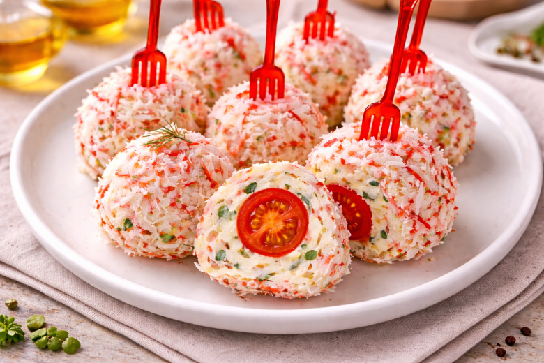 Каждый шарик обвалять в крабовой стружке, выложить на тарелку и убрать в холодильник хотя бы на 20–30 минут.