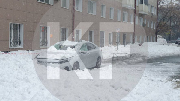 На фото видно автомобиль, вероятно, иномарку. Судя по кадрам и сообщению, куча сошедшего с крыши снега придавила машину и нанесла ей повреждения. Рядом с автомобилем, на который рухнула глыба, видно ленту, судя по всему, наклеенную для ограждения территории.