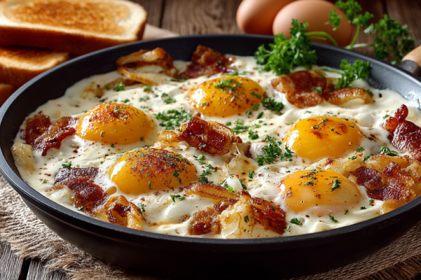 Рецепт: грудинку нарежьте небольшими брусочками или кубиками. Выложите на хорошо разогретую сковороду и обжарьте на среднем огне до вытапливания жира и появления румяной корочки. Лук нарежьте тонкими полукольцами или кубиками, добавьте к грудинке и обжаривайте ещё 5-7 минут до мягкости и золотистого цвета лука. Убавьте огонь до минимума. Влейте сметану, тщательно перемешайте и прогревайте 2-3 минуты. Затем аккуратно вбейте яйца. Посолите, поперчите, накройте крышкой и готовьте на самом маленьком огне 5-7 минут до желаемой степени готовности яиц.
